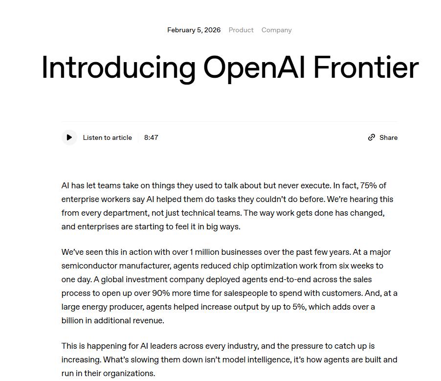 当地时间2月5日,OpenAI正式推出了企业级AI平台Frontier。这并非又一个聊天机器人,而是一个旨在帮助企业“构建、部署和管理”AI智能体的系统,甚至能管好竞争对手家的“员工”。