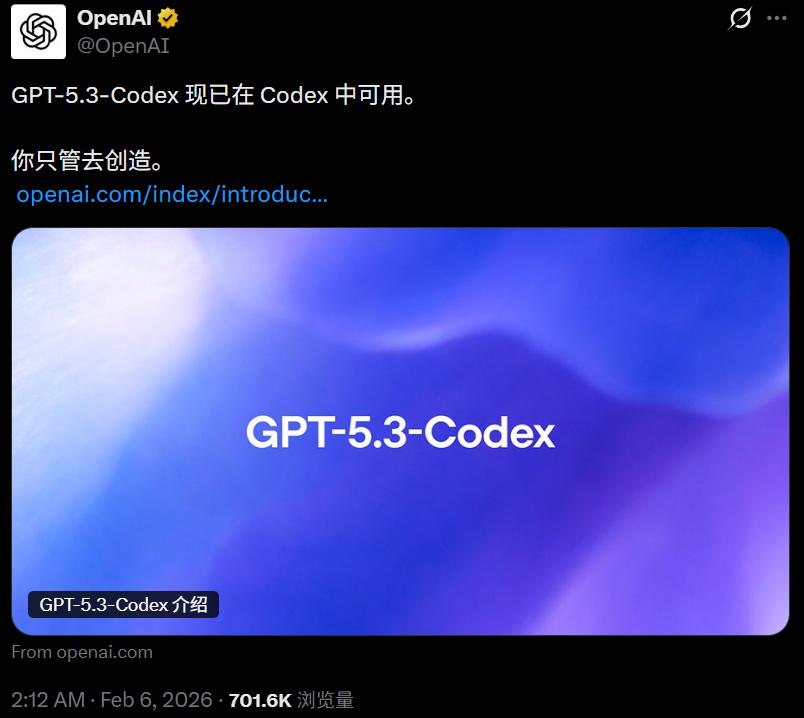 作为回应,OpenAI仓促应战,不过半小时紧急祭出最强智能体编程模型——GPT-5.3-Codex。