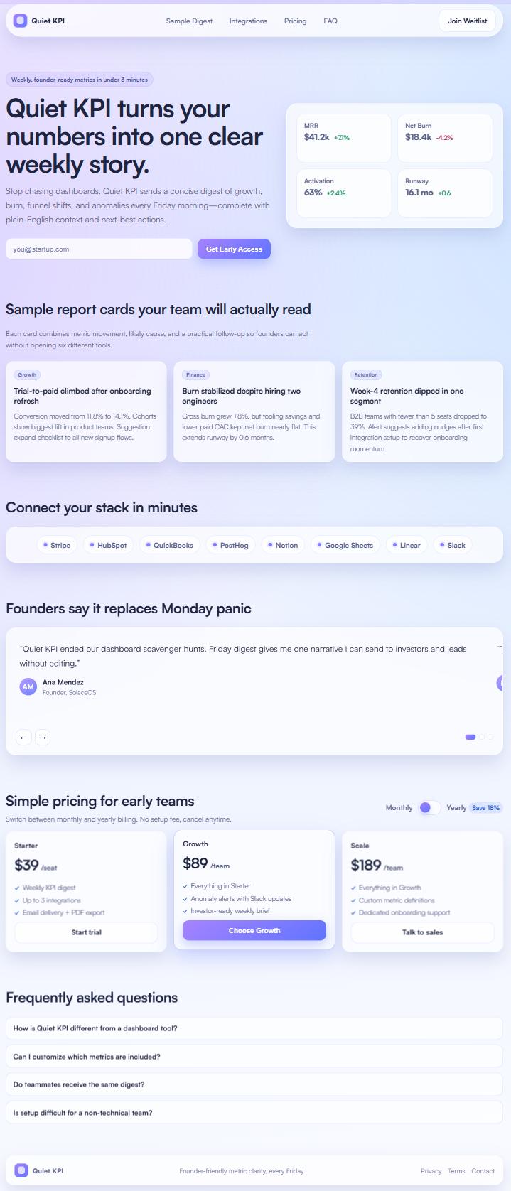 为Quiet KPI构建一个落地页,这是一个对创始人友好的每周指标摘要。美学风格采用柔和的SaaS风,玻璃质感卡片,薰衣草色到蓝色的渐变,微妙的模糊效果。板块包括:带有邮箱收集的首屏,示例报告卡片网格,集成列表行,客户证言轮播,月付/年付价格切换,常见问题解答,页脚。