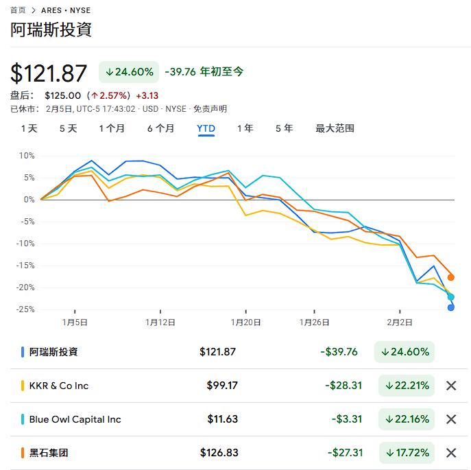 周四,美国PE三巨头股价全线下跌。Ares暴跌超11%至121.87美元,KKR下跌5.5%至99.19美元,Blue Owl下跌3.8%至11.65美元。今年以来,这三家公司及包括黑石在内的私募资本同行股价累计跌幅均跌超15%,投资者正在重新评估其增长前景。