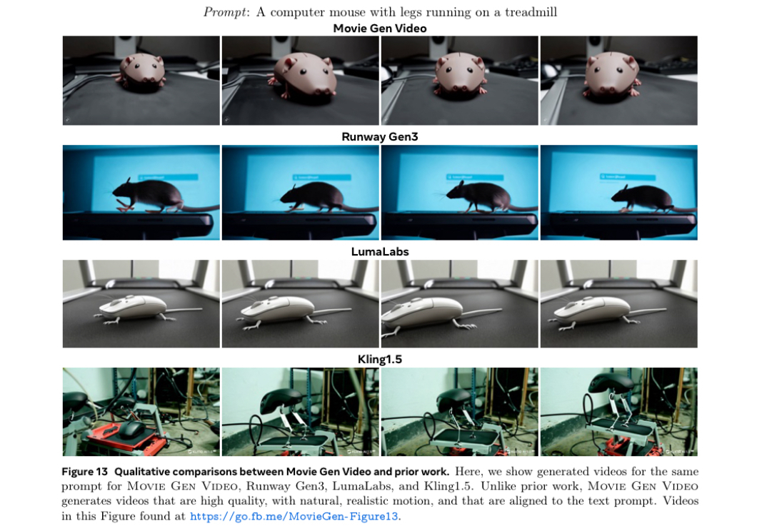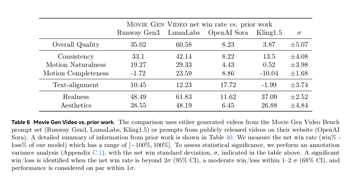 通过进行胜率比较,Movie Gen Video 在整体质量上显著优于 Runway Gen3和 LumaLabs,对 OpenAI Sora有轻微的优势,与国内的可灵 1.5 相当。