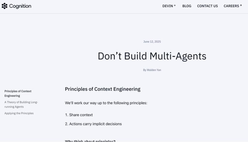 那是在2025年6月,Cognition官方下场,撰写文章《不要构建多智能系统》。他们主张用单一智能体+强大的上下文工程来实现长期可靠的agent行为,尤其适合深度、连续、顺序性强的任务,如软件工程、编码全流程。