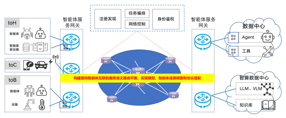 动态组网与服务语义路由:通过智能体服务网关、网络控制器与编排器,实现面向智能体协同任务的按需动态组网、大模型算力供给的算网融合服务语义路由等。