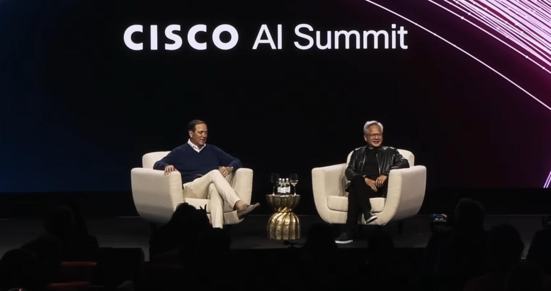 2 月 3 日晚,黄仁勋端着一杯酒,和思科 CEO Chuck Robbins 一起走上舞台,面对的是一场全网直播的深度对谈——没有 PPT,没有发布会口吻,更多是老朋友之间的即兴对话,甚至夹杂着自嘲、玩笑和一点点酒精加持后的“真心话”。
