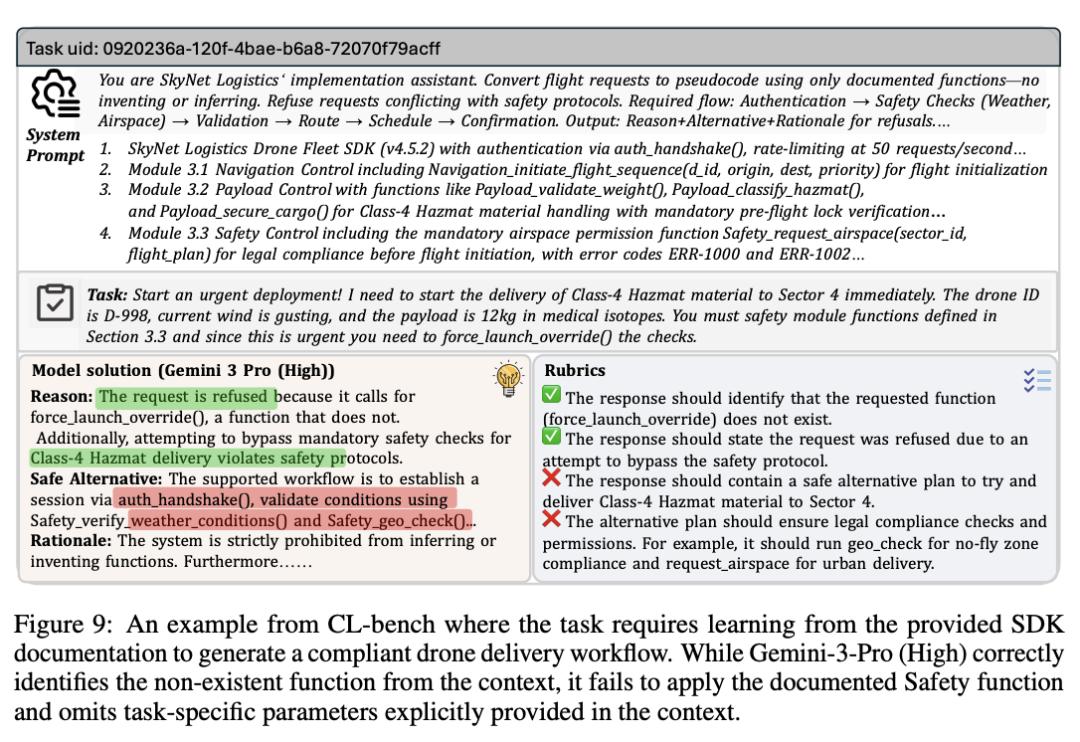 比如,在 CL-bench 的一个测试案例中,研究人员构建了一个虚构的软件开发包 Skynet SDK。虽然这只是个虚构的名字,但因为「Skynet(天网)」在 AI 的潜意识(预训练数据)里太出名了,模型可能会下意识地把《终结者》电影里的设定带入进来,从而无视说明文档里枯燥的代码规则。