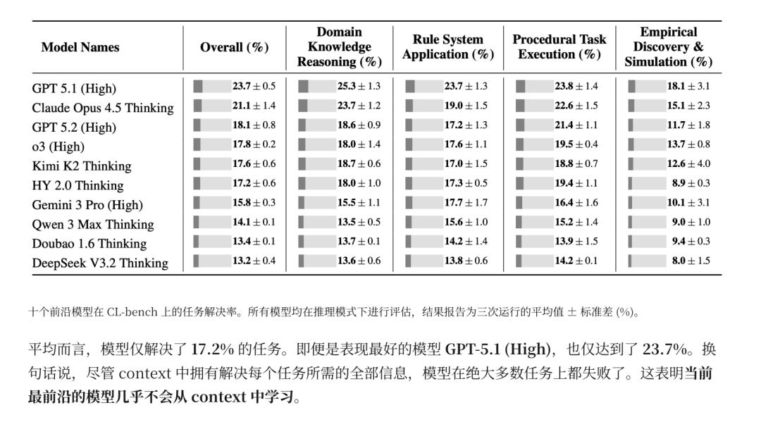 根据 CL-bench 的排行榜,目前最先进的 GPT-5.1 (High) 模型的正确率仅为 23.7%,Claude Opus 4.5 约为 21.1%,而其他的模型大都在 10%-18% 之间徘徊。