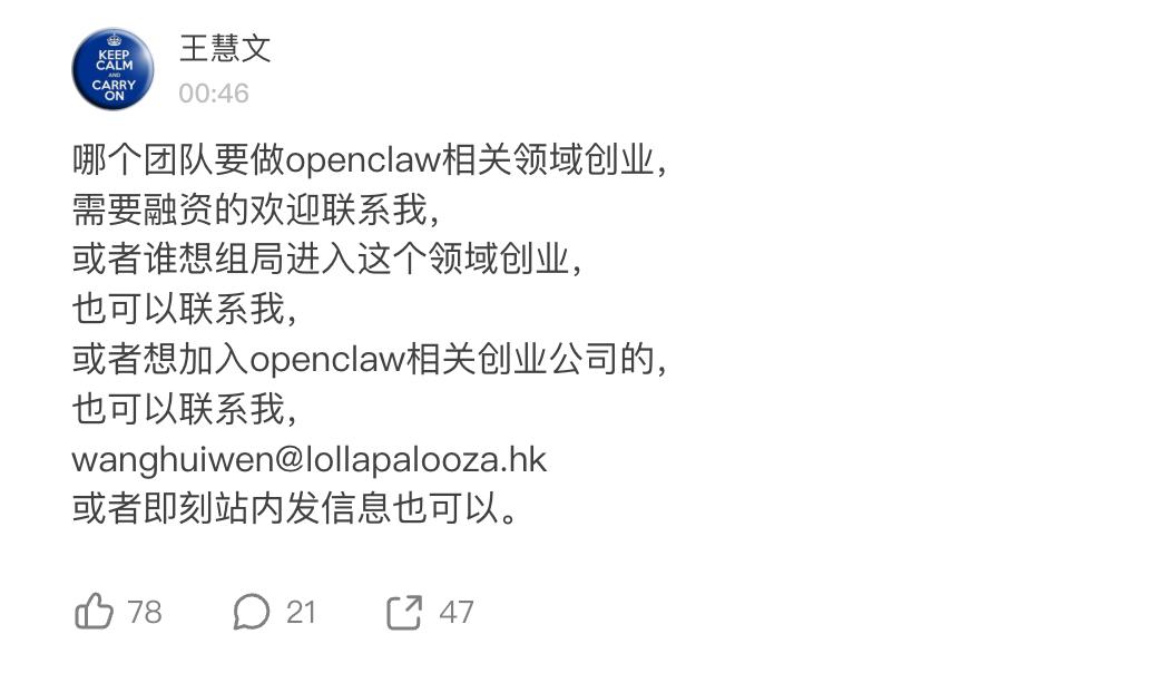 这次,他不再组局做大模型,而是瞄准了当下最火热的赛道:Clawdbot(现改名为“OpenClaw”)。投资、攒聚,甚至当“猎头”,在Clawdbot身上,王慧文倾注了不亚于对大模型的热情。
