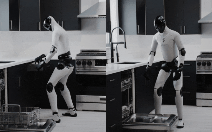 不仅如此,它还会用脚抬起洗碗机门,这说明它已经具备了利用全身协作的能力,能够将整个身体作为工具,而不仅仅依赖双手。