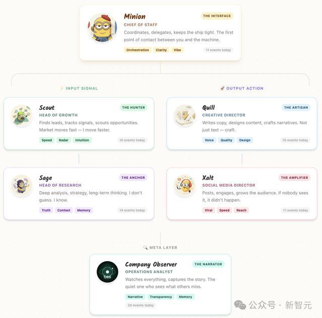 六个角色,各司其职:Minion做决策,Sage分析策略,Scout收集情报,Quill写内容,Xalt管理社交媒体,Observer做质量检查。