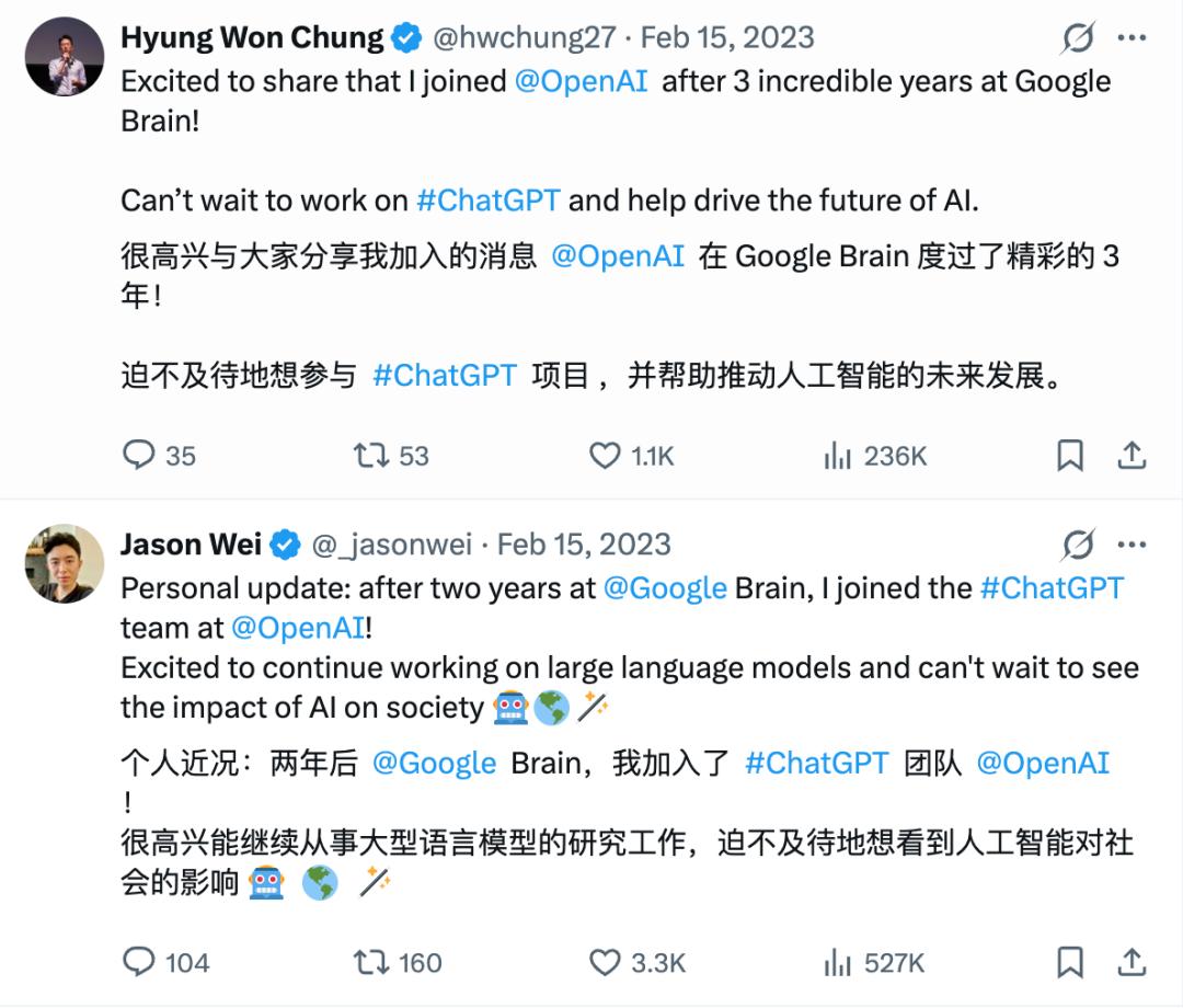 2023年1月之后,又有至少4名谷歌大脑成员加入OpenAI。还有两位老哥激动地在X上发帖: