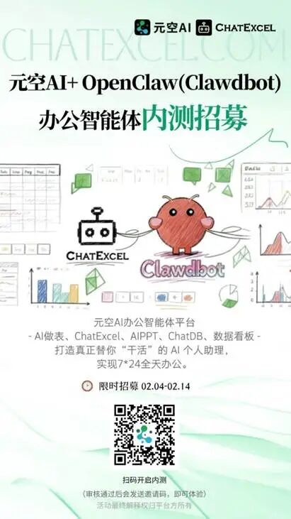 “我们太激动了,也真是太佩服了,没想OpenClaw能力这么强大,还开源。”“我们马上决定,在OpenClaw基础之上开发一个全面的办公智能体,结合我们之前的ChatExcel等办公全家桶,形成全面为职场员工服务的个人AI:元空AI+OpenClaw”。并且,2月4日马上开始招募内测!“