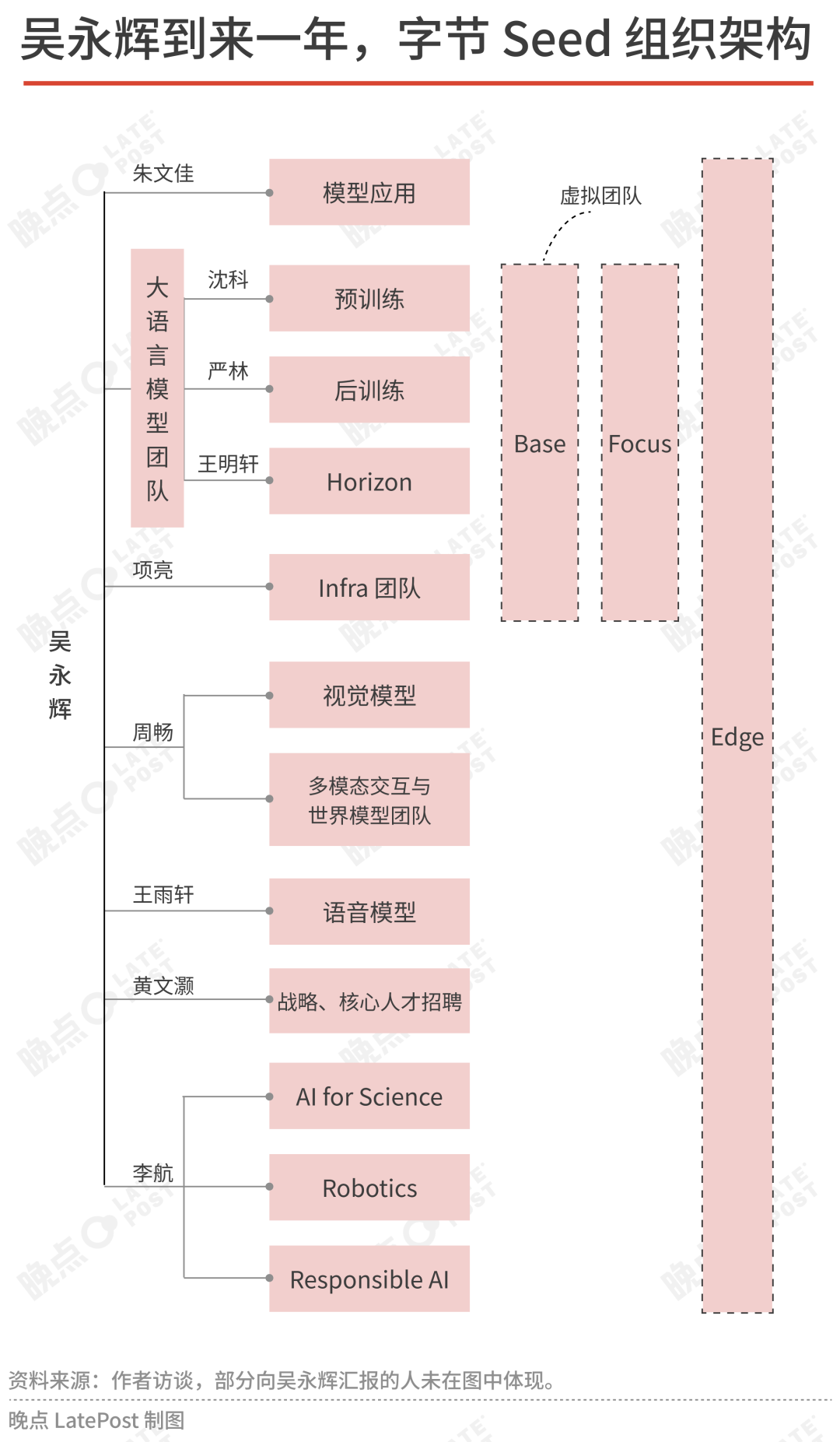 Infra(基础设施)团队由项亮负责。字节跳动的 AI Lab 带着剩下的三个研究方向——AI for Science、Robotics、Reponsible AI 并入 Seed,负责人李航向吴永辉汇报。