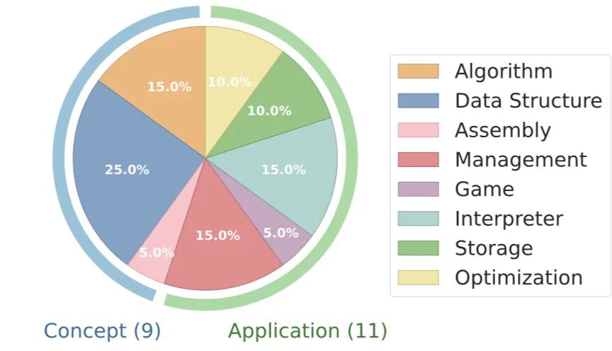 研究团队从上海交通大学ACM班(https://acm.sjtu.edu.cn/home)的在线判题平台精选20道高难度编程项目,涵盖算法、数据结构、解释器、管理系统、存储组件等8大类别。