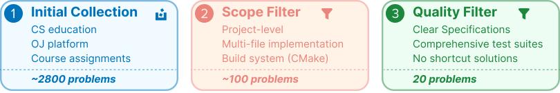 范围过滤:保留需要多文件实现、模块组织、构建配置的项目级任务,排除纯算法单文件题目,剩余约100道
