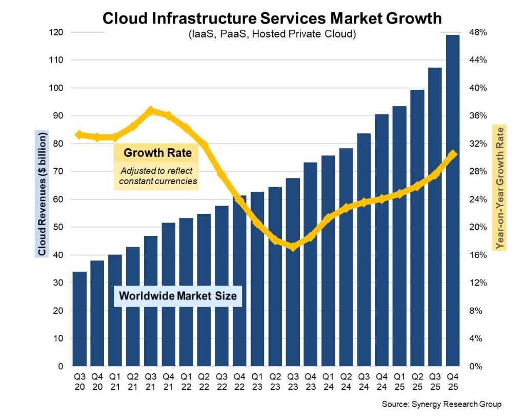 根据Synergy Research Group 统计数据,2025年,全球云基础设施服务带来的总收入约为4190亿美元,从市场份额来看,亚马逊AWS(28%)、微软Azure(21%)和谷歌云(14%)位列前三。