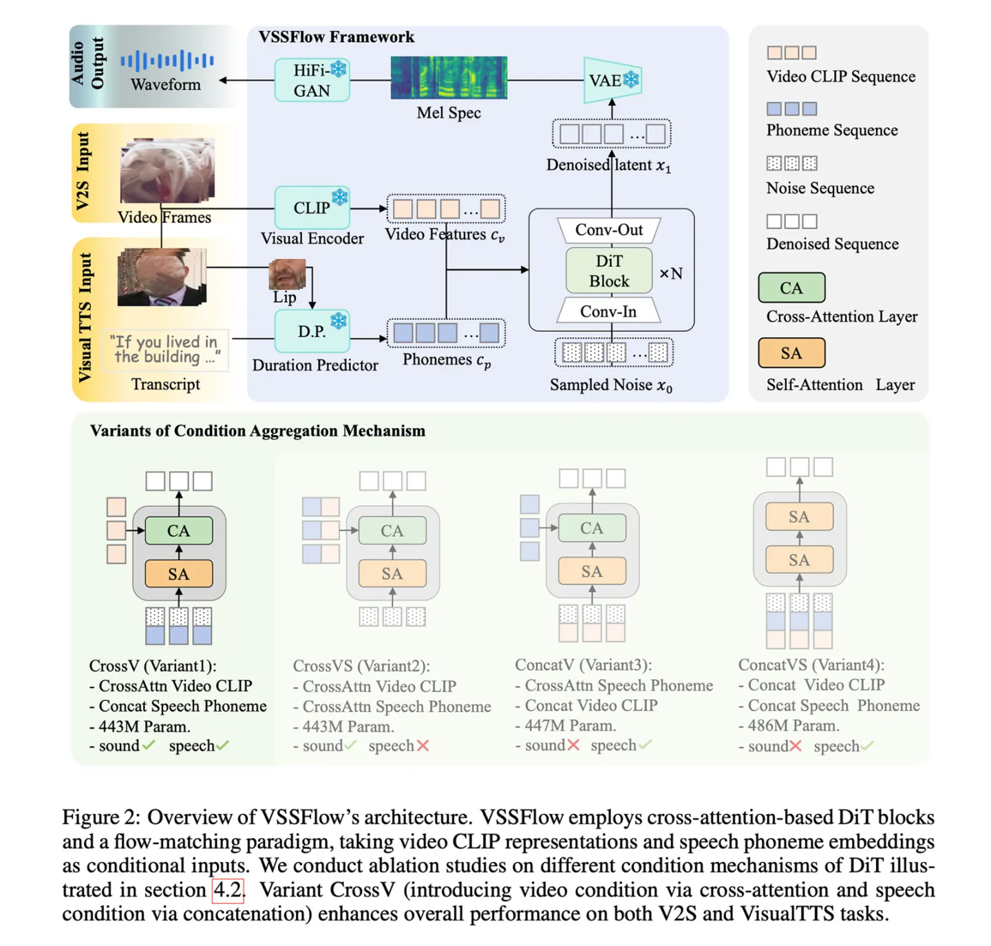 传统的解决方案通常是将两者分阶段训练,这不仅增加了系统的复杂性,还常因任务冲突导致性能下降。VSSFlow 则另辟蹊径,采用了 10 层架构设计并引入“流匹配”技术,让模型自主学习如何从随机噪声中,重构出目标声音信号。