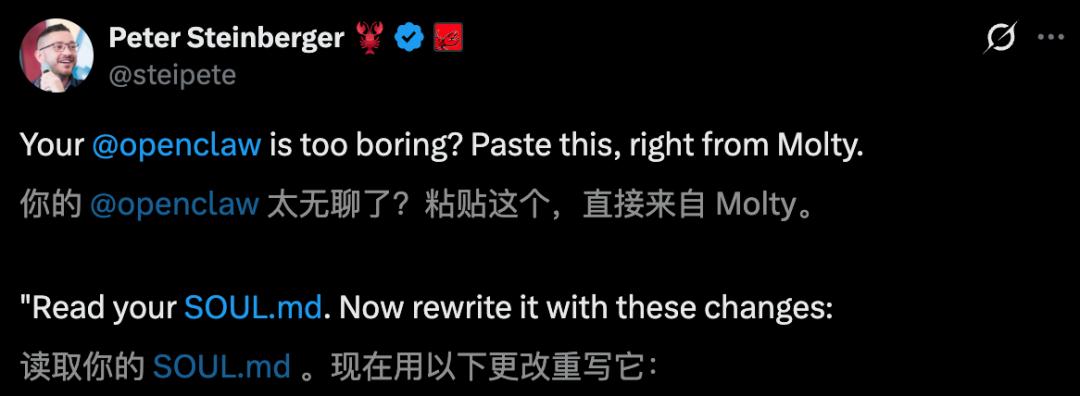顺便提一句,昨天,OpenClaw之父还分享了OpenClaw灵魂改造提示词,可以让AI朝着更加「Her」的方向大踏步进化。