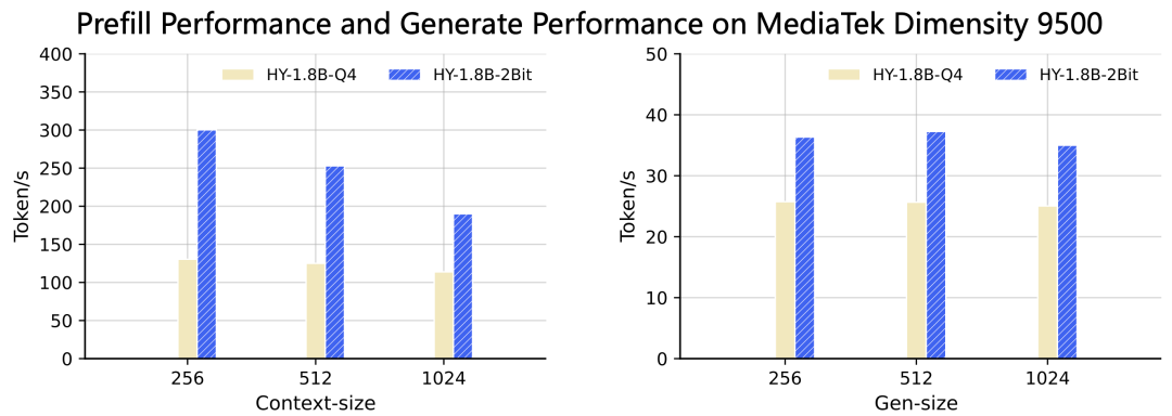在天玑 9500 上同样进行了测试,对比 HY-1.8B-Q4 格式首字时延能够加速 1.5~2 倍,生成速度加速约 1.5 倍。