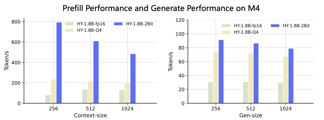 在 MacBook M4 芯片上,HY-1.8B-2Bit 固定了线程数为 2 测试了不同窗口大小下的首字时延和生成速度,模型选定 fp16、Q4、HY-1.8B-2Bit 三种 gguf 格式作为对比,首字时延在 1024 输入内能够保持 3~8 倍的加速,生成速度上常用窗口下对比原始模型精度,HY-1.8B-2Bit 能够实现至少 2 倍稳定加速。