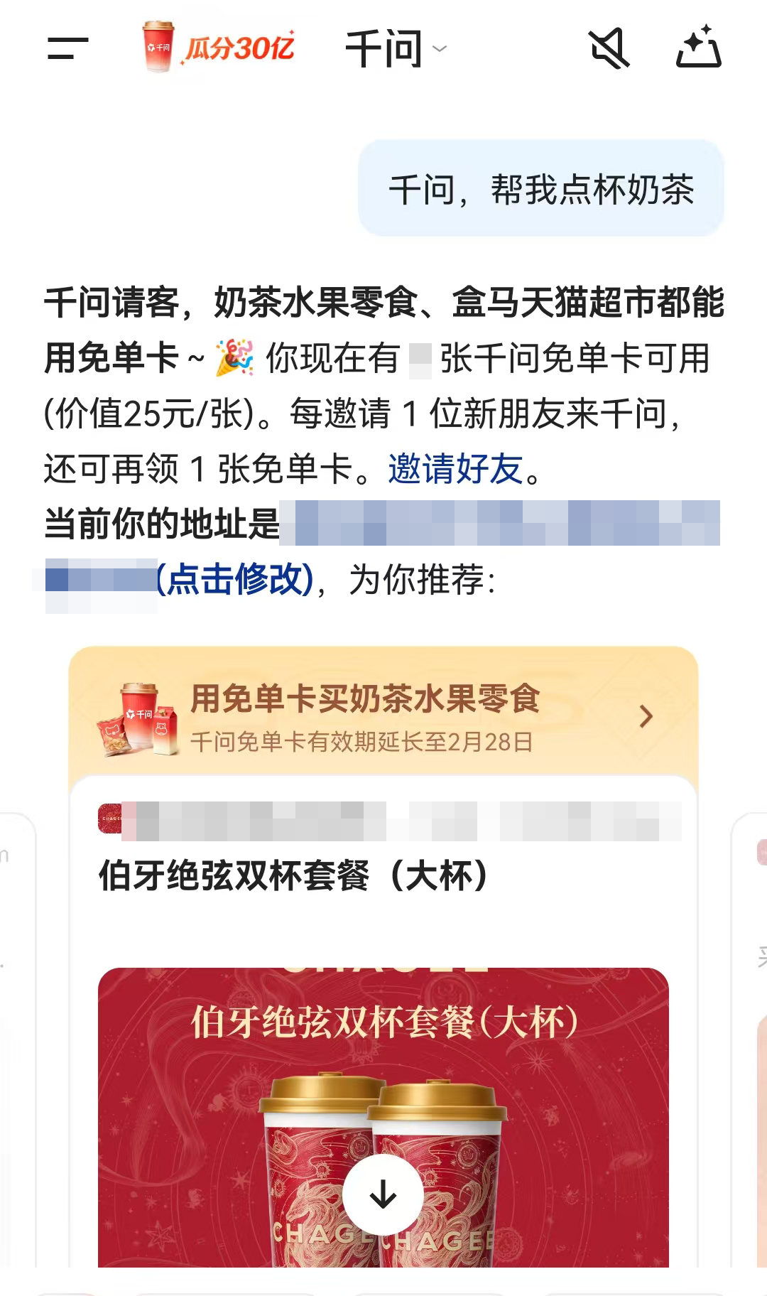 首轮福利简单直接:邀请全国人民用AI一句话免费点奶茶。但实际上,免单卡不仅可以用来点奶茶。“千问崩了”登上热搜后,千问App“紧急”宣布将免单卡有效期从2月23日延长至28日,并强调可用于在盒马买鱼、买菜、买鸡蛋、买蛋糕、买年货等多品类商品。