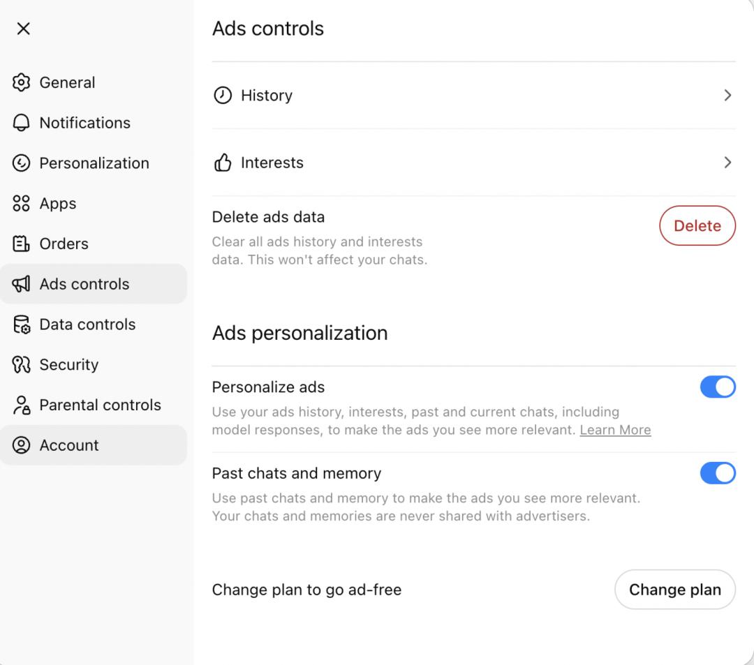 同时,该公司称,广告商只会获得汇总的广告浏览量和点击量数据,不会获取用户的 ChatGPT 对话个性化数据或内容。免费版和 Go 版用户都可以对广告反馈、关闭广告个性化设置、关闭基于历史对话的广告推荐,从而限制赞助内容的推送方式并删除广告相关数据。此外,OpenAI 现在并非对所有用户和对话都会投放广告,比如 18 岁以下用户以及涉及健康、心理健康、政治等特定敏感话题的对话场景。即便免费版与 Go 版的成年用户,也未必会立即看到广告,因为该功能仍处于测试阶段。