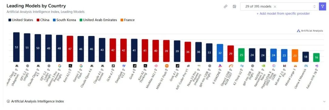 全球AI大模型评分情况,蓝色是韩国AI产品(数据&图源:Artificial Analysis Intelligence Index)