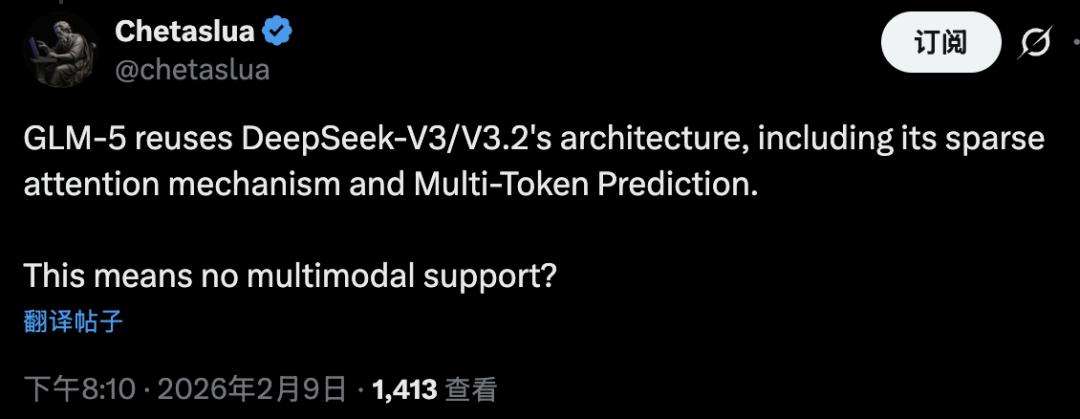 但也有人提出疑问:DeepSeek-V3架构以纯文本为主,GLM-5首发版本是否会因此缺失多模态能力?