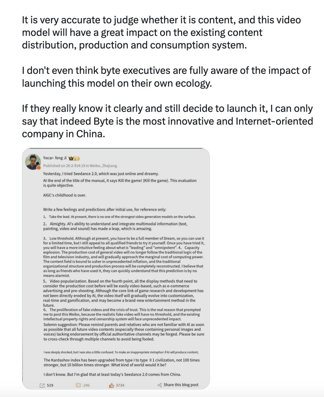最后以《黑神话*悟空》制作人冯骥聊字节的视频模型Seedance2.0的一张微博截图结尾,它被翻译成英文在Twitter上传播。