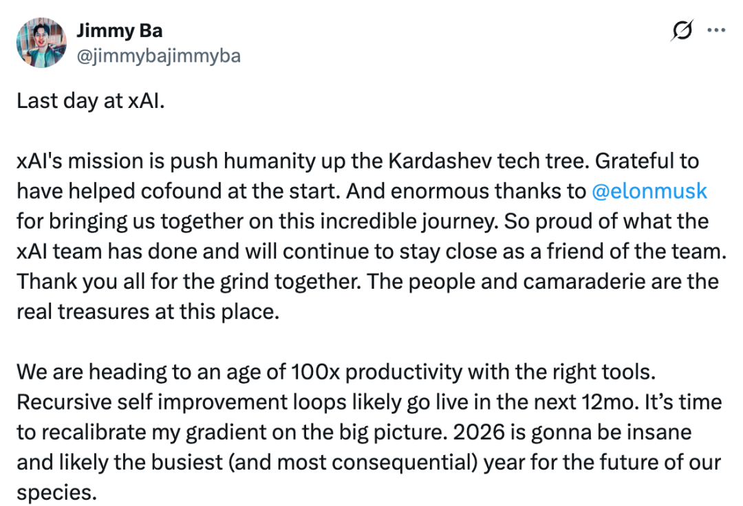 吴宇怀宣布离职后还不到24小时,其博士生导师、另一位xAI联合创始人Jimmy Ba也跟着宣布自己也要离开xAI了。