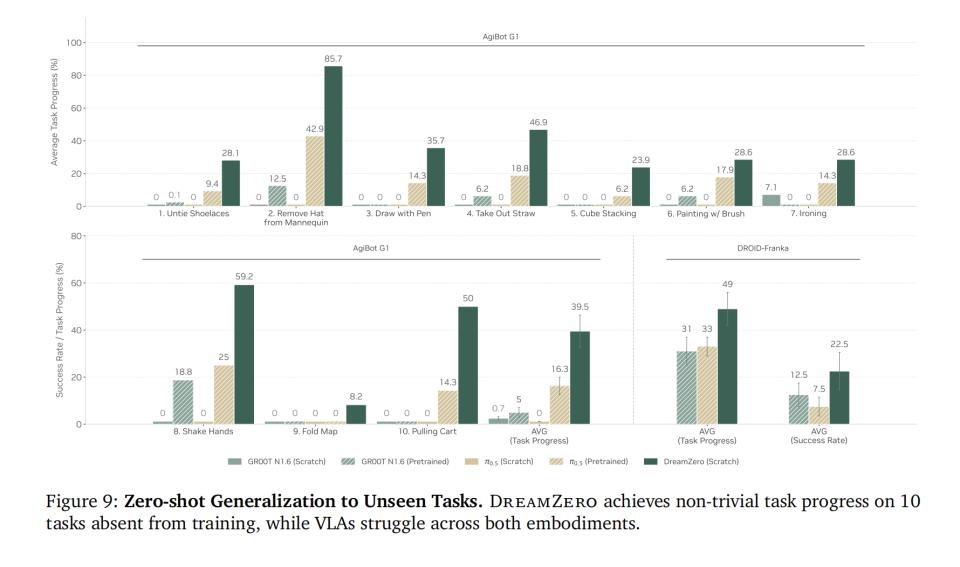 让从头训练的VLA来做,任务进度几乎为零,开始的地方都做不好。但DreamZero的平均任务进度达到了39.5%,某些特定任务(如摘帽子)甚至高达85.7%。