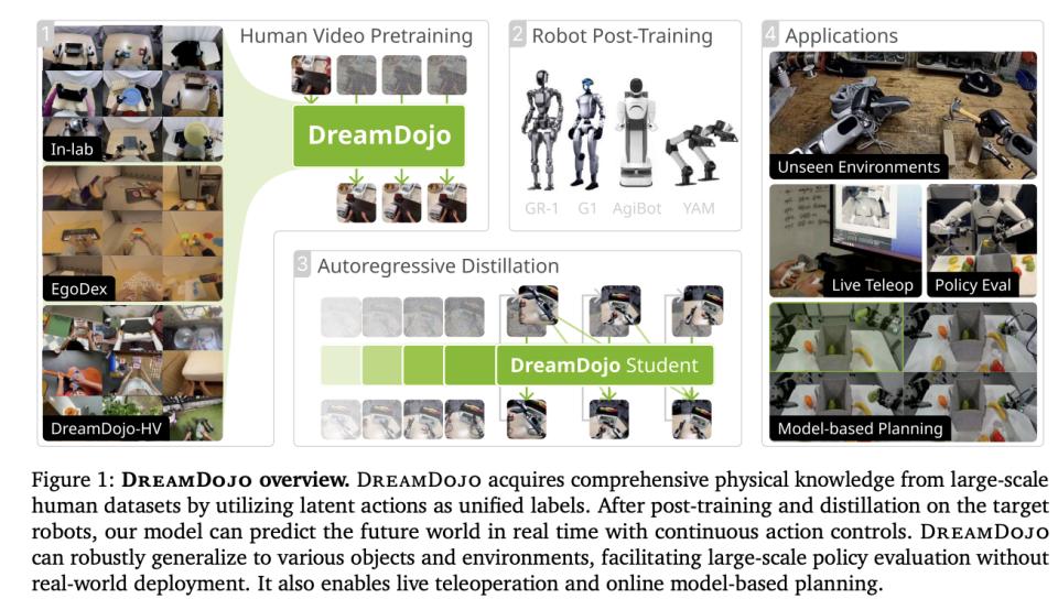 DreamDojo 在视频生成这个世界模型的基础上,用连续潜在动作这个数学上的通用语,把全人类的视频资产转换成了机器人可以理解的经验。