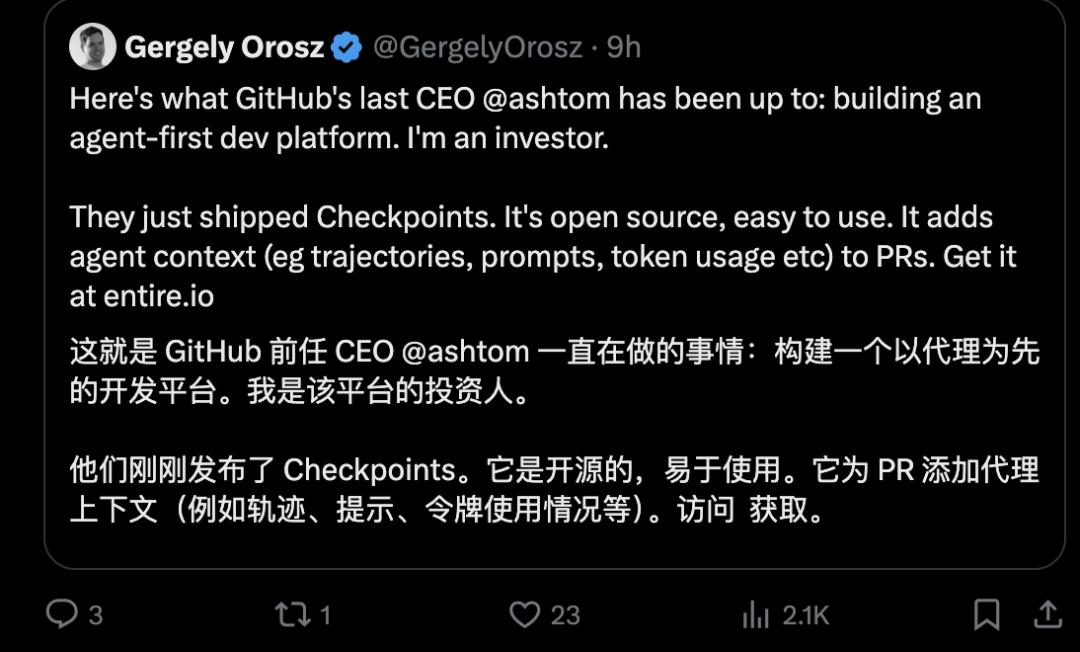 据 Dohmke 介绍,Entire 是一个平台,但它未必会与 GitHub 展开竞争。Dohmke 表示,其理念是在技术栈的更高层构建一个平台,让开发者能够管理智能体的推理过程并与之协作。代码仓库仍将是其中的核心。