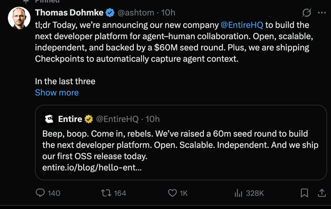 今年 48 岁的 Thomas Dohmke 创办了一家名为 Entire 的新公司,这是一个面向“智能编码时代”的开源开发者平台。