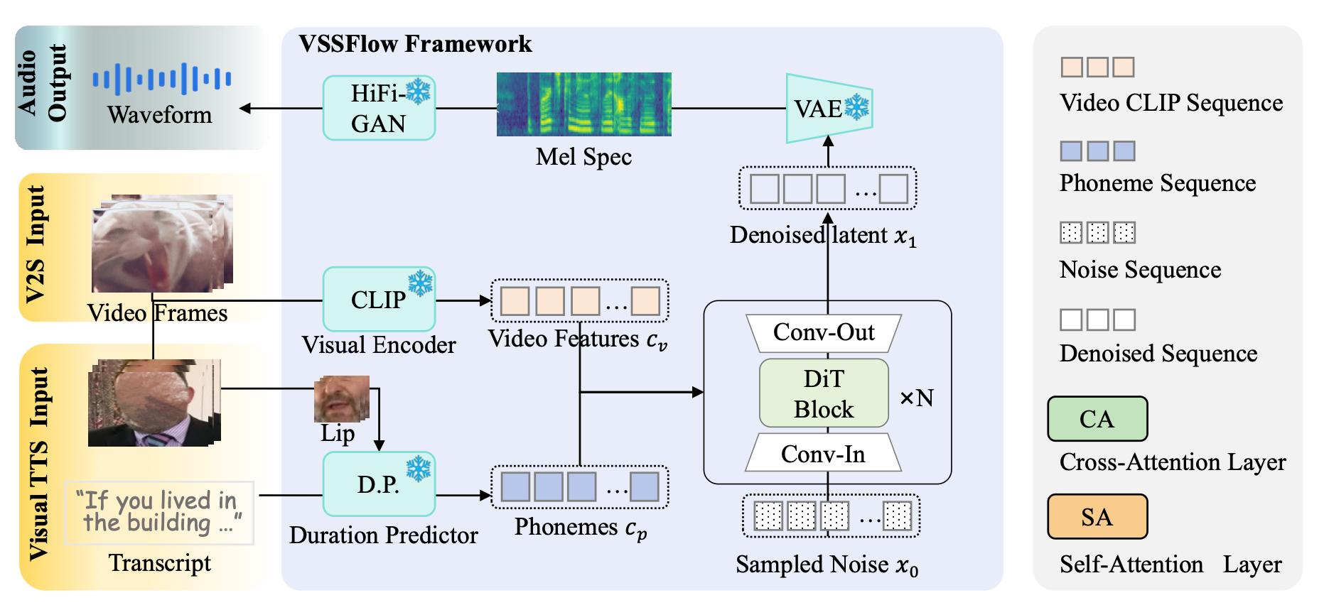 VSSFlow的视频生成人声技术,特点在于通过视频脚本+视频画面来生成音频,可以通过画面中人物的口型、表情等因素来匹配语音的语气、情绪、节奏等,从而生成更真实的AI人声。