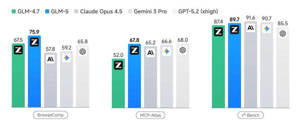 GLM-5 在Agent 能力上实现开源 SOTA,在多个评测基准中取得开源第一。在 BrowseComp(联网检索与信息理解)、MCP-Atlas(大规模端到端工具调用)和 τ²-Bench(复杂场景下自动代理的工具规划和执行)均取得最高表现。