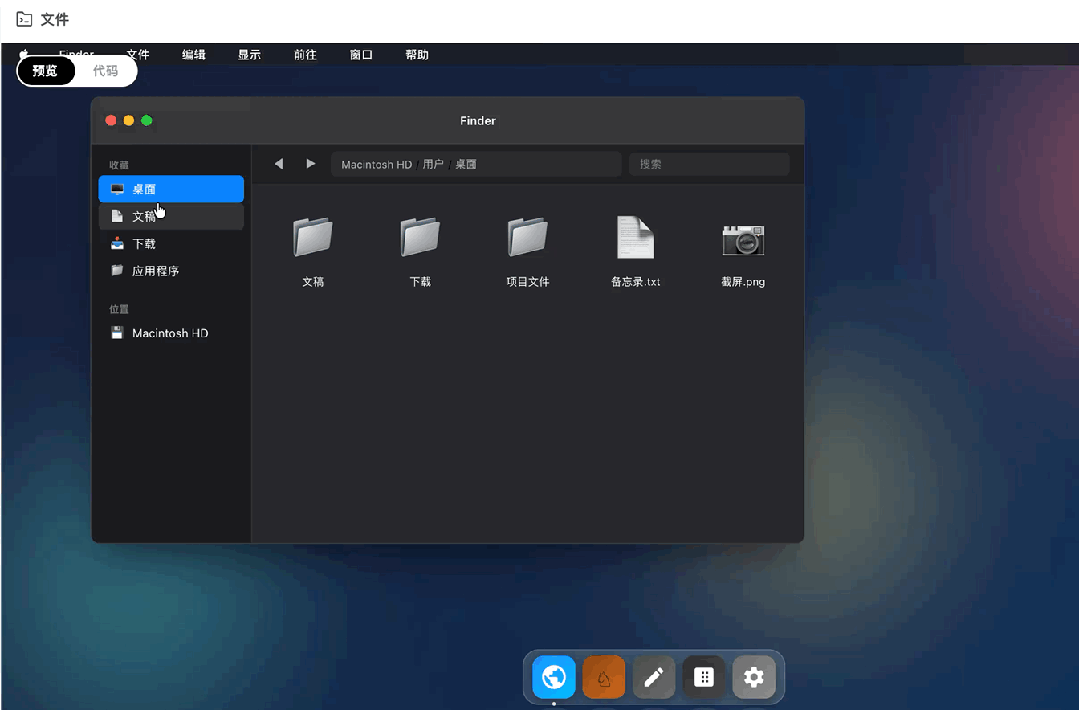 从最终呈现效果来看,这个 macOS 仿真桌面整体完成度较高,视觉结构清晰,Finder 窗口布局、侧边栏层级、面包屑导航和文件区域划分都较为准确,深色主题氛围、窗口圆角与阴影效果也较为自然,Dock 的毛玻璃质感和图标排布具有较强的还原度,整体已经达到一个可交互的高质量演示级 Demo 水平。