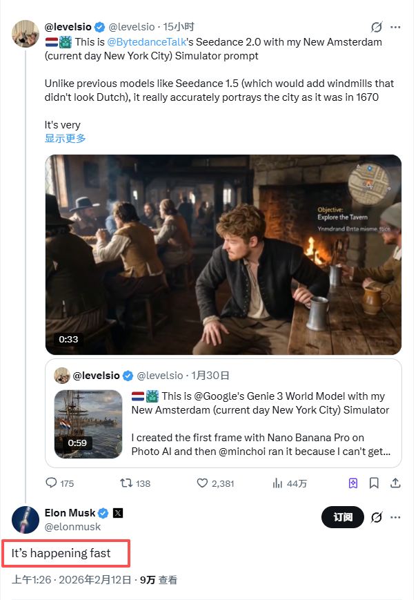 凤凰网科技讯 2月12日,近日,字节跳动视频模型Seedance 2.0火到海外。马斯克在其社交平台X转发评论Seedance 2.0相关推文,并表示模型发展速度太快(It's happening fast)。