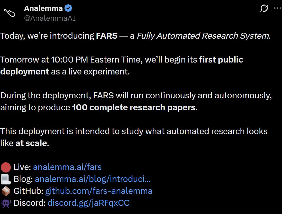 Analemma 在推文中声称,他们将面向全球公开直播部署端到端 AI 研究系统 FARS。