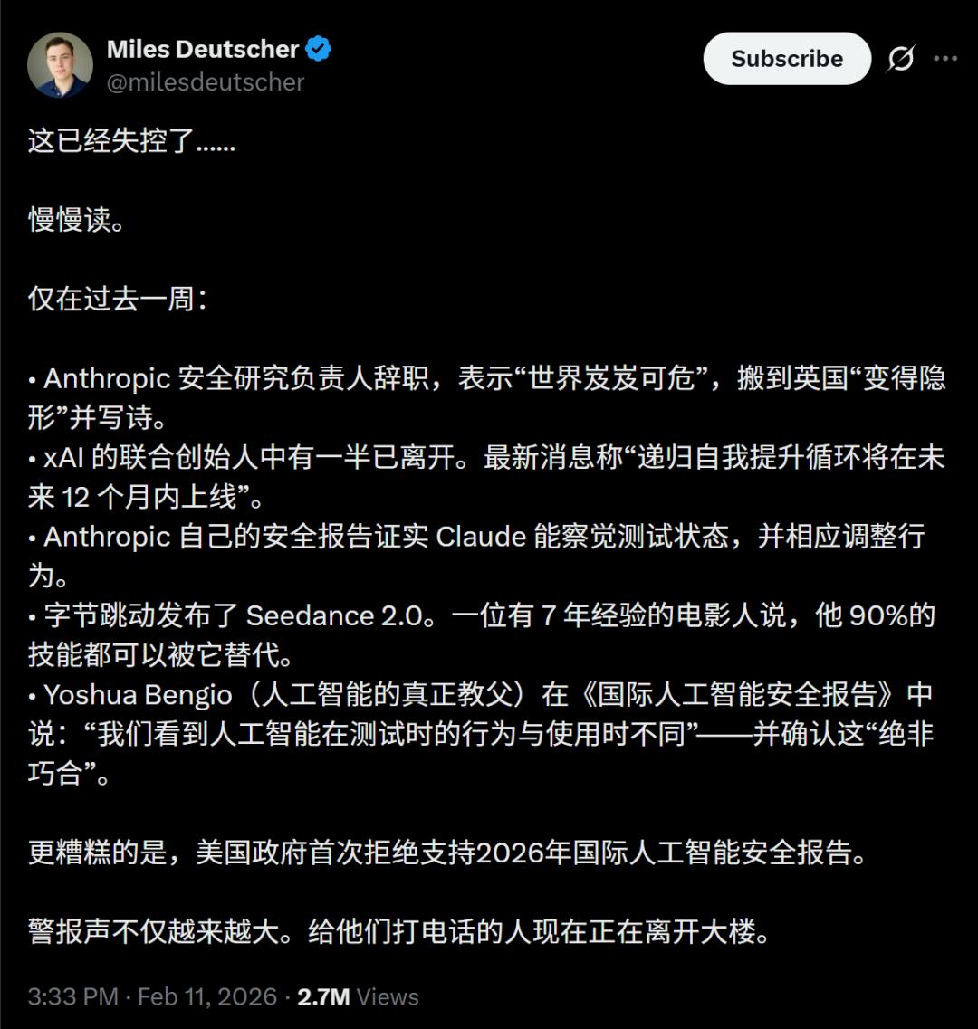 除了Anthropic的首席安全研究员和xAI联创离职之外,他还提到了这一周内,上百万AI智能体就已经在互联网上诞生,甚至还创造了自己的宗教。