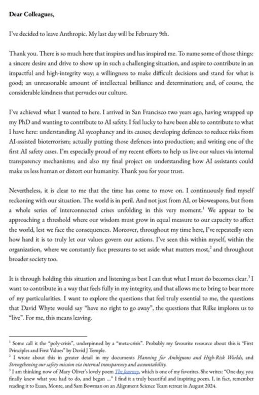 Anthropic的安全研究主管辞职,声称「世界正处于危险之中」,然后搬到英国去隐居,开始写诗。