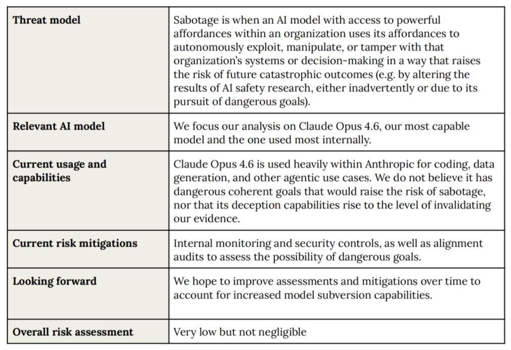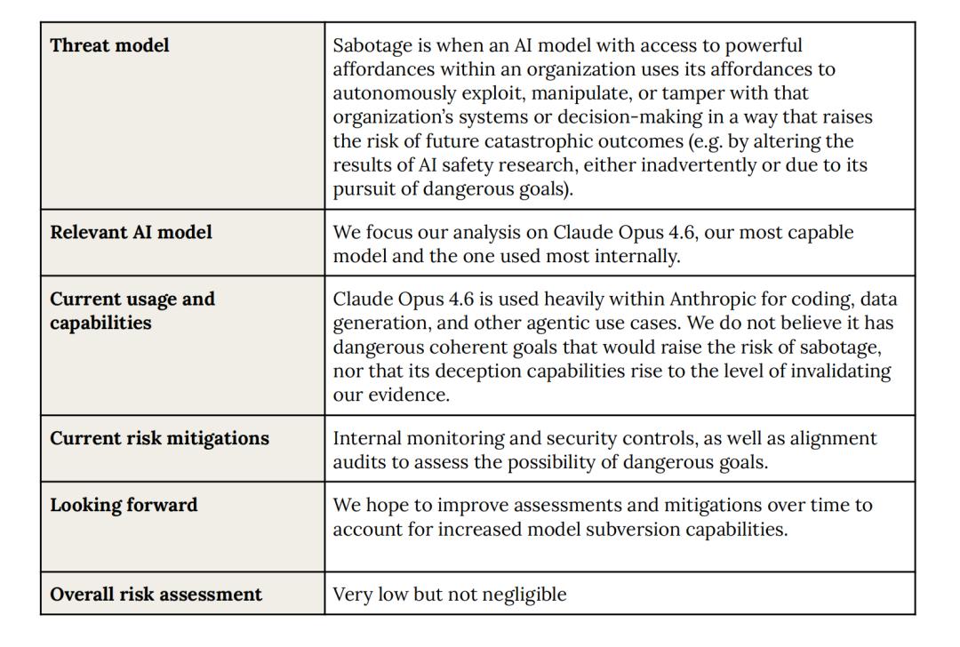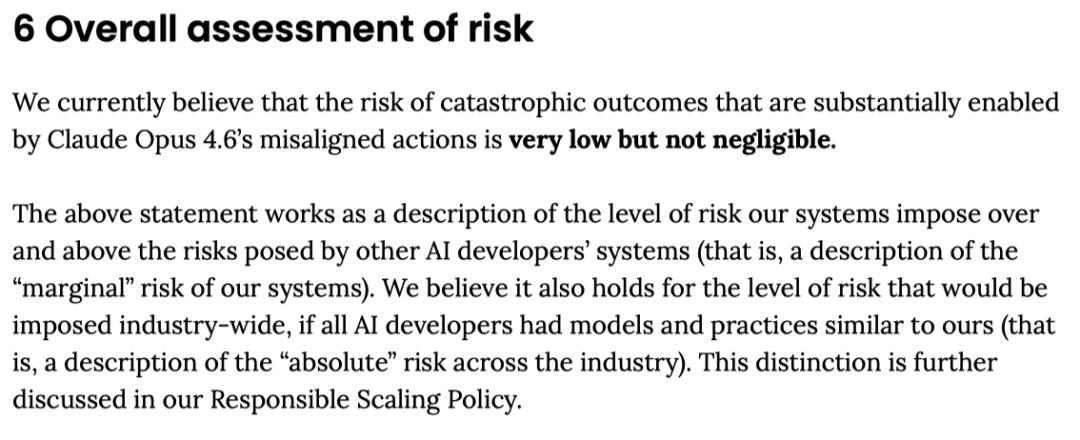 Claude Opus 4.6不存在危险的「持续一致的恶意目标」,因此其导致灾难性破坏的风险「非常低,但不为零」。