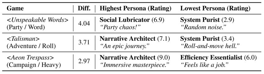 在此基础上,团队引入经典的MDA(机制-动态-美学)游戏设计理论构建推理核心,使模型能够跨越静态文字、推演游戏运行时的动态交互,并进一步从评价数据中提炼出五种典型玩家画像,让AI内化特定偏好以模拟“千人千面”的真实感受。