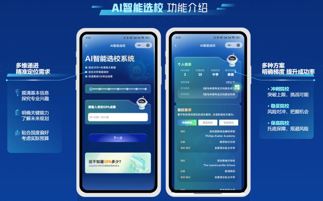 类似的产品化趋势正在留学申请领域同步发生。学生输入 GPA、语言成绩、目标国家与预算区间后,AI 即可自动生成选校清单,并输出申请时间线与材料准备路径。