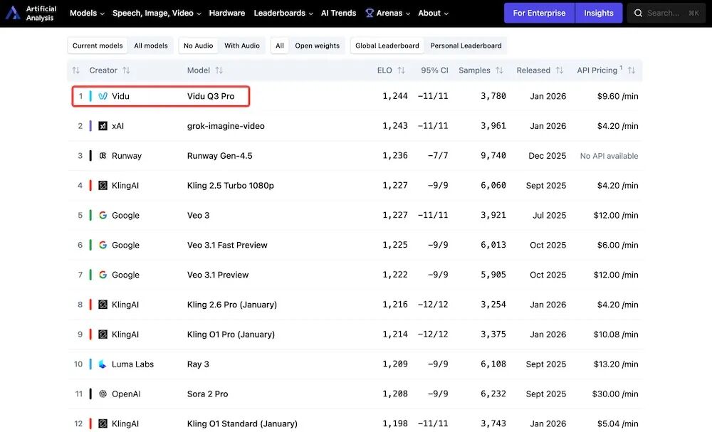 与此同时,另一款国产视频生成模型生数科技的Vidu Q3,也在创作者社群中走红,并刚刚登顶全球权威AI评测平台Artificial Analysis,成为全球排名第一的视频生成模型。