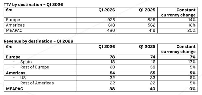 从HBX Group最新披露的2026财年第一季度数据来看,其整体交易规模(TTV)同比增长16%,达到20.23亿欧元。但收入仅同比增长5%,整体变现率(take rate)约为8.4%,比去年同期下降约0.9个百分点。