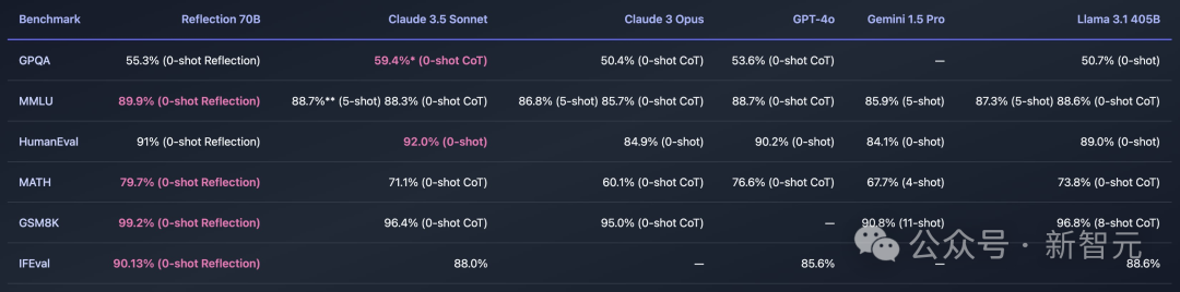 用 Meta 的开源 Llama 3.1-70B,团队微调出了 Reflection 70B。它的基准测试结果惊人,可以和 Claude 3.5 Sonnet 以及 GPT-4 这类顶级闭源模型一较高下,直接登顶「世界开源新王」!