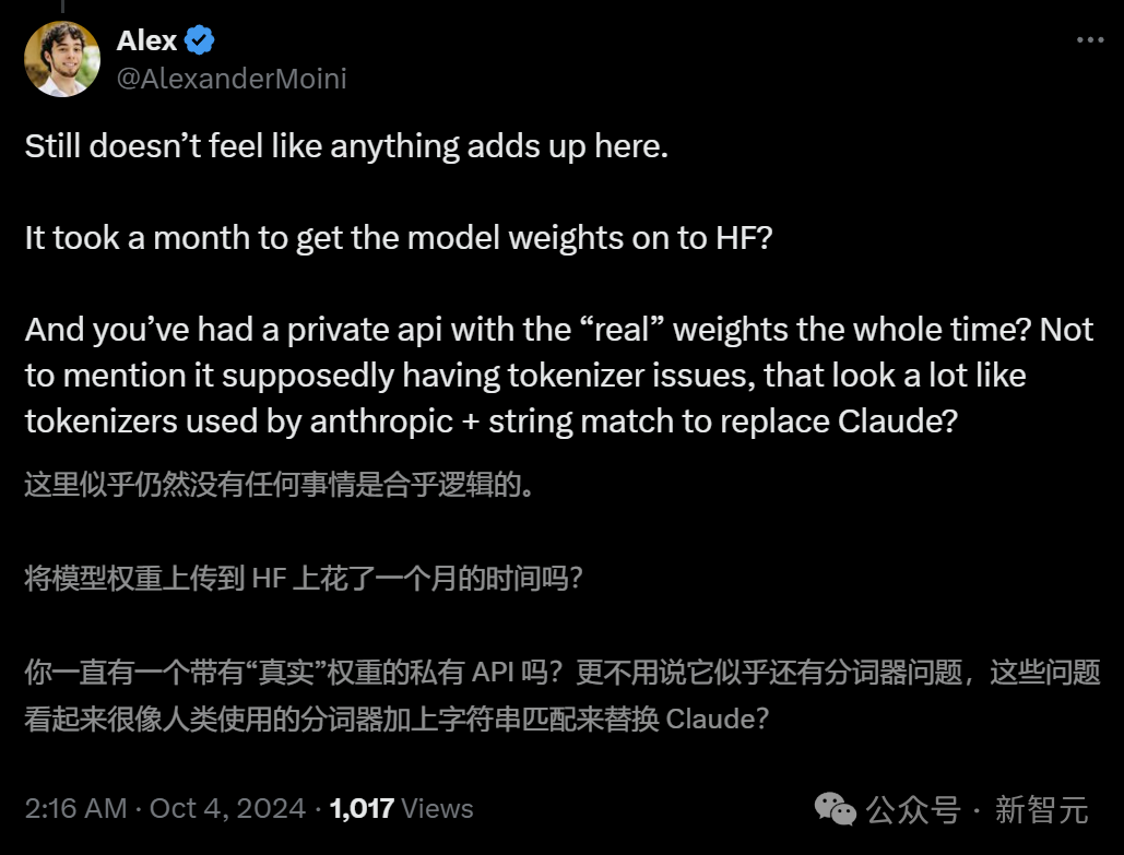 AI 研究员 Alexander Moini 表示:为什么花了一个月的时间才将模型权重传到 Hugging Face 上?你们到底有没有一个带有「真实权重」的 API?