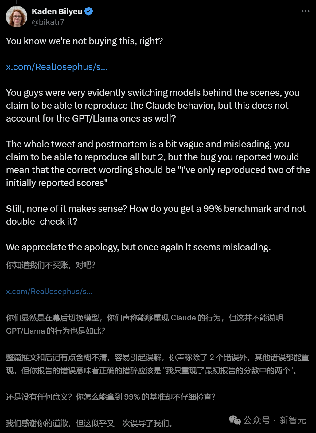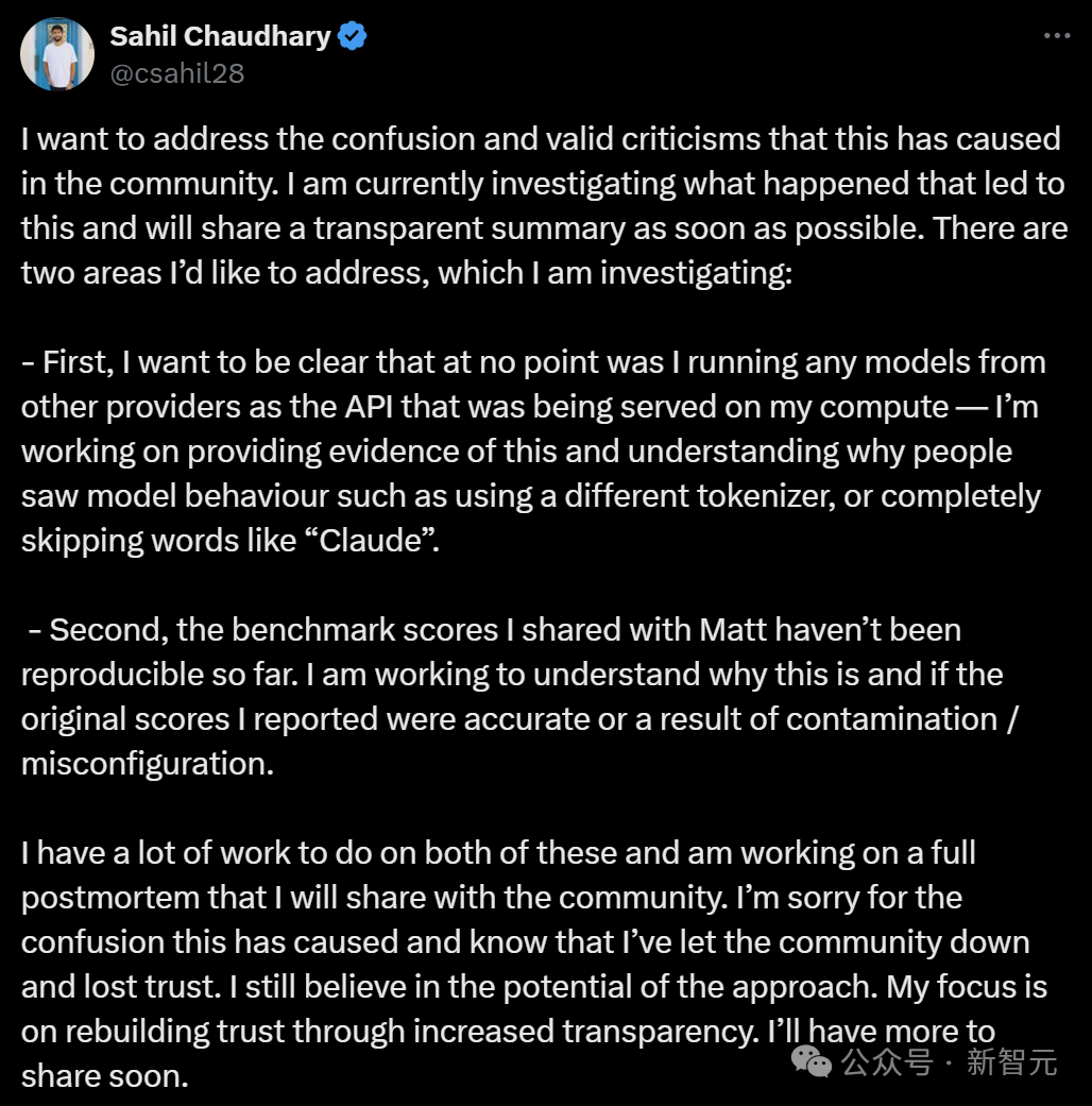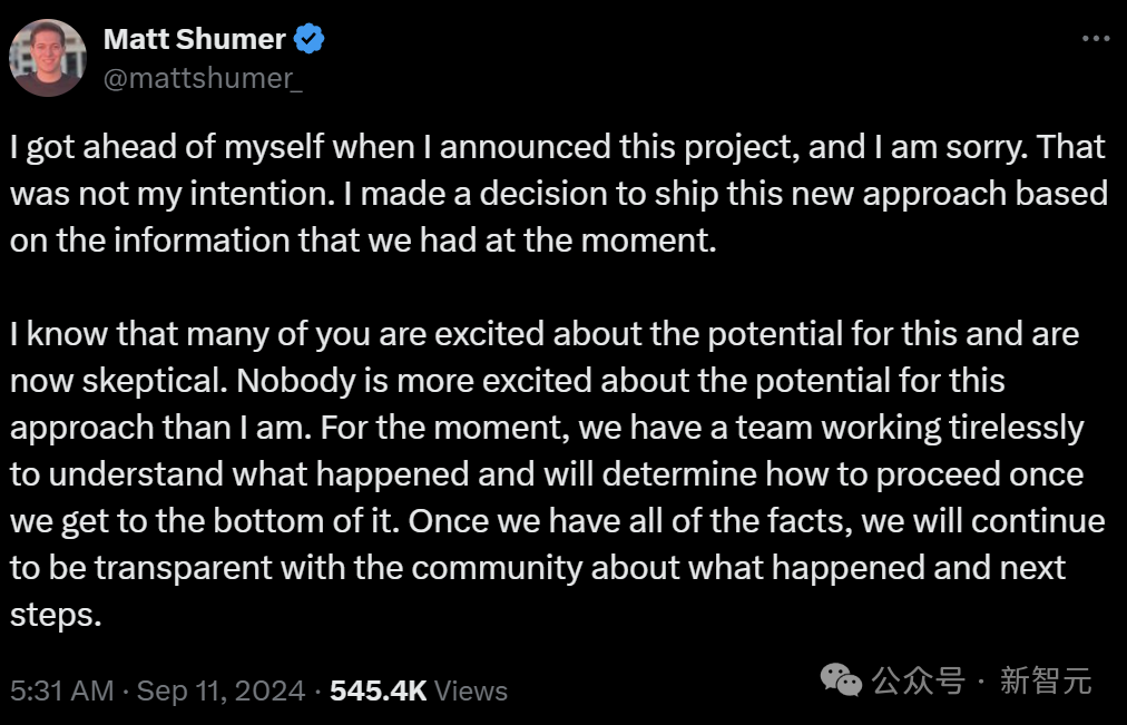 Matt Shumer 在 X 上发帖承认了这一错误,表示非常遗憾。
