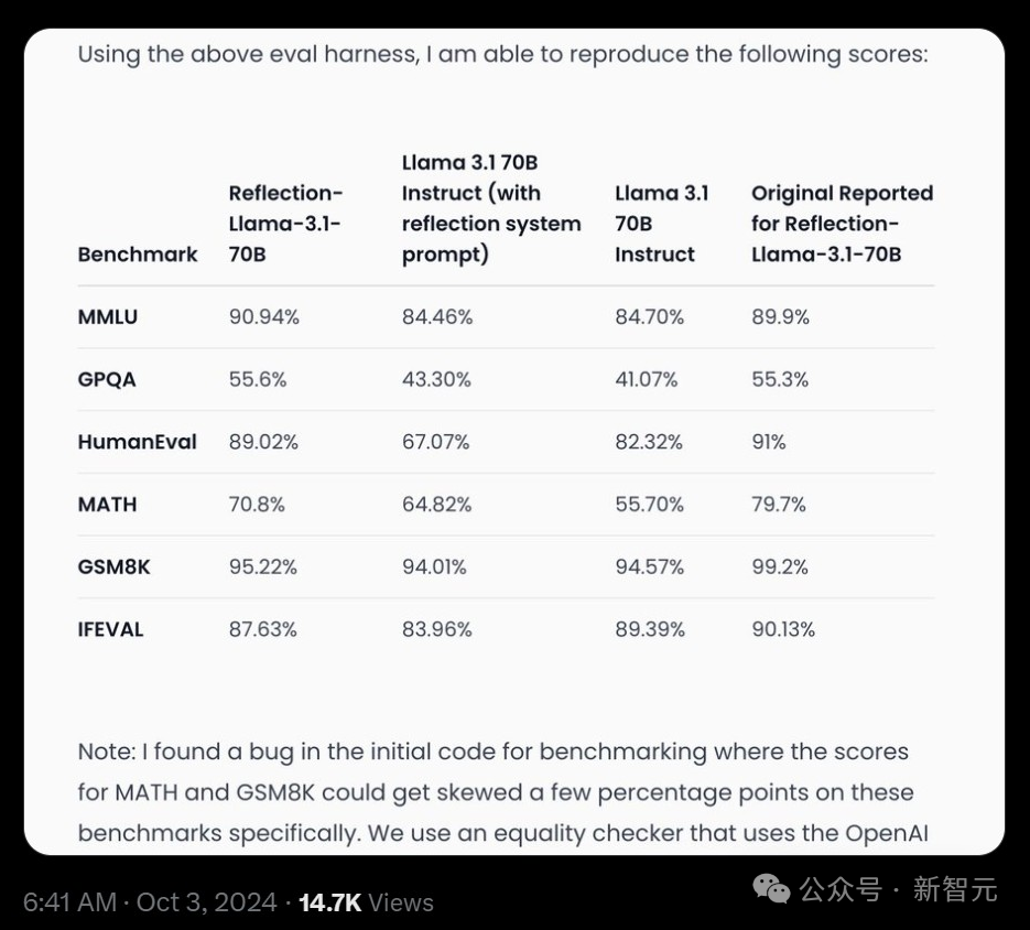 之前的 Reflection 70B 的几个测试结果之所以出现了几个百分点的偏差,是因为初始代码中的一个 bug。