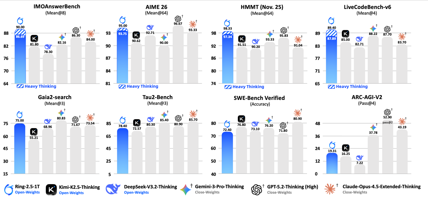 Ring-2.5-1T 在数学、代码、逻辑等高难推理任务(IMOAnswerBench、AIME 26、HMMT 25、LiveCodeBench、ARC-AGI-V2)和智能体搜索、软件工程、工具调用等长程任务执行(Gaia2-search、Tau2-bench、SWE-Bench Verified)上均达到了开源领先水平。